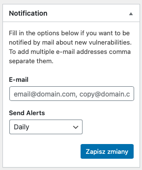 Skonfiguruj codzienne powiadomienia o wykrytych podatnościach w sekcji Notification znajdującej się po prawej stronie okna. Podaj adres e-mail, na który chcesz otrzymywać powiadomienia. Kliknij w przycisk Zapisz zmiany.