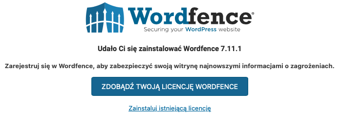 Zobaczysz poniższy komunika. Kliknij w przycisk Zdobądź Twoją licencję Wordfence.