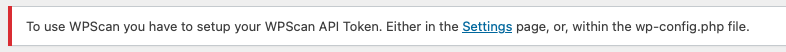 Zobaczysz poniższy komunikat. Kliknij w podświetlony napis Settings, lub przejdź do sekcji WPScan > Settings.